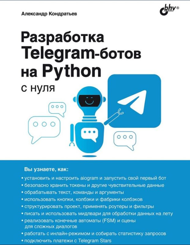 Создавайте умные и полезные Telegram-боты на языке Python с помощью фреймворка aiogram! Эта книга проведет вас через все этапы разработки — от запуска первого бота до построения сложных диалоговых систем, интеграции платежей и тестирования.